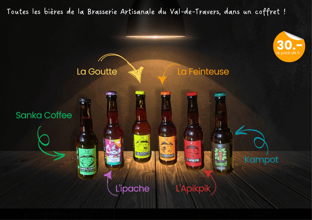 Le coffret comprend quatre bières traditionnelles : La Goutte (blonde), La Feinteuse (ambrée), la Sanka Coffee (brune – stout) et l‘IPAche (IPA) et deux spécialités de la BAV